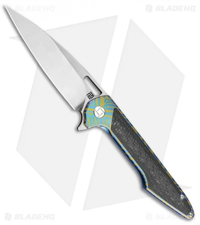 This model of the Artisan Cutlery Archaeo features a blue and green stripe coated titanium handle with a satin finished Bohler M390 blade and satin hardware.