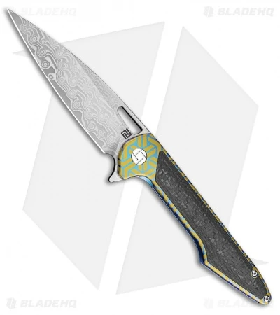 This model of the Artisan Cutlery Archaeo features a green and blue coated titanium handle with a polished damascus blade and satin hardware.