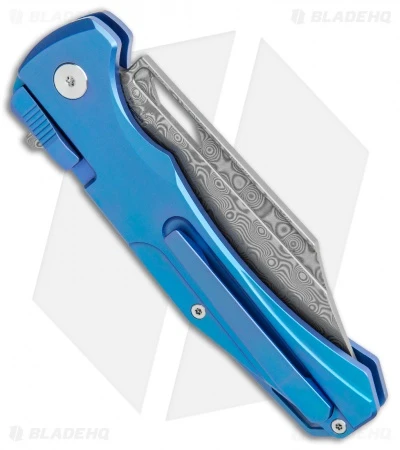 This Blowback model has a blue titanium handle and a Damascus blade.