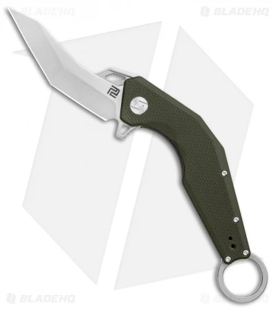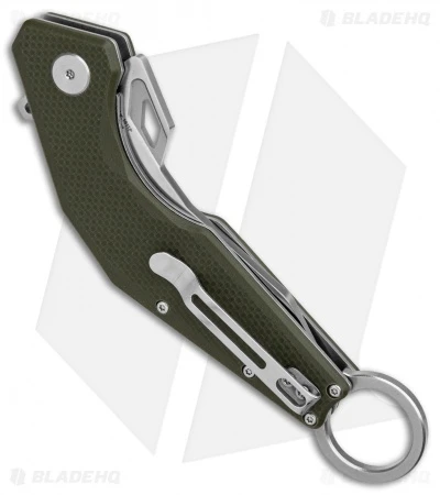 - Curved handle with a finger ring and green G-10 scales.
