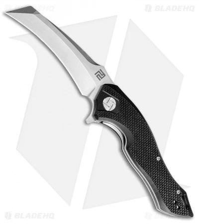 The Artisan Cutlery Eagle features a dramatic modern design for comfortable EDC use and carry. This model is outfitted with a black G-10 handle and a stonewashed D2 steel blade. The Eagle is a high-performance folding knife that’s defined by a large hawkbill blade with a curved edge that is mirrored by the ergonomic handle lines. Item includes a reversible stainless steel pocket clip.