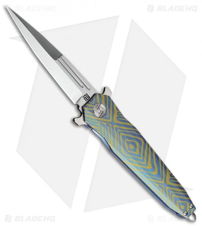 The Hornet is a high-performance EDC folding knife built with a classic Italian stiletto inspired design. This Hornet model is equipped with a blue stripe titanium handle and a satin finished S35VN steel blade. The blade features a double wing guard that functions as a blade flipper for smooth deployment. The Artisan Cutlery Hornet features a sleek, streamlined design for comfortable use and carry.