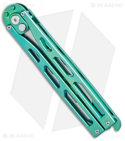 This model of the Artisan Cutlery Kinetic-Tool sports a green anodized titanium handle with a satin finished dull blade.