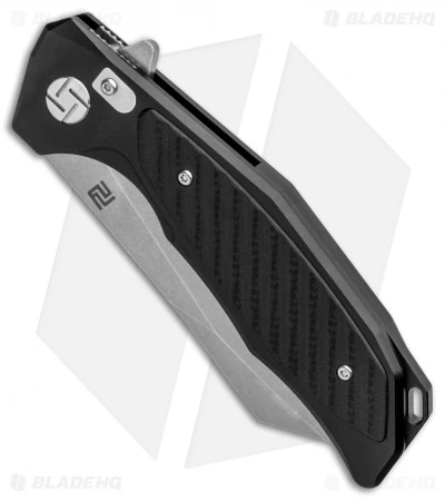 - Black aluminum handle with black G-10 inlay and carbon fiber texture.