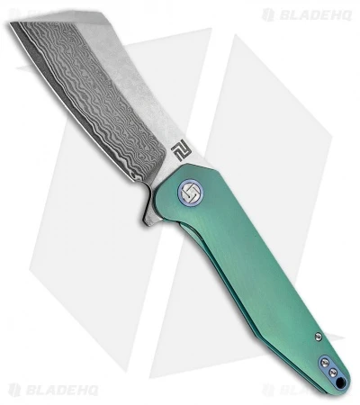 Add a one of a kind design to your collection with the Artisan Cutlery Osprey folding knife. This model is outfitted with a modified sheepsfoot blade and a green titanium handle. The ultra wide blade is made from damascus steel for making light work of any difficult cutting task. Skeletonized stainless steel liners reduce weight while providing a solid framework for the handle. An integrated lanyard hole and a titanium backspacer complete the package.