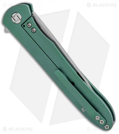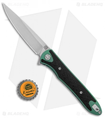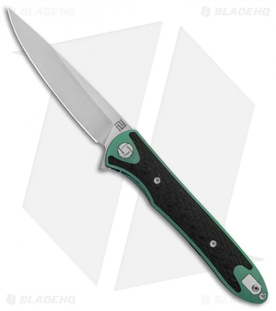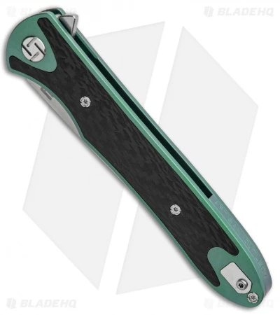 - Green titanium handle with a carbon fiber overlay.