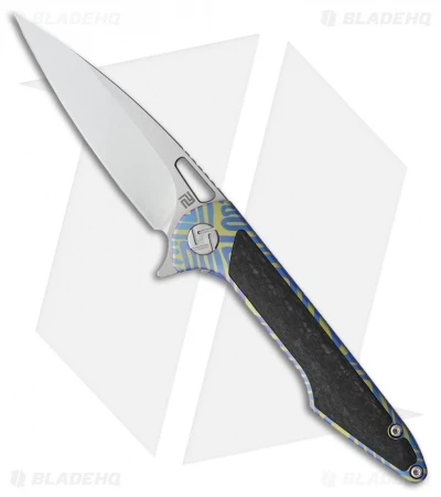 This model of the Artisan Cutlery Small Archaeo features a green and blue coated titanium handle with a satin Bohler M390 blade and satin hardware.