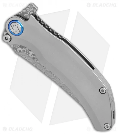 This Tacit model has a Damascus tanto blade and a titanium handle.