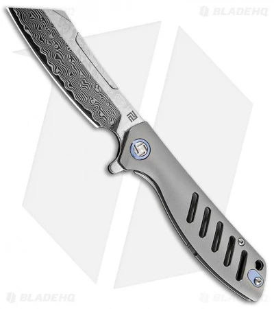The Artisan Cutlery Tomahawk was designed with a unique profile that will look great in your collection. This model sports a gray titanium handle and a modified wharncliffe damascus steel blade. A ceramic ball bearing pivot offers smooth deployment with the aid of a flipper. An anodized pivot collar and a deep carry pocket clip finish off the design.